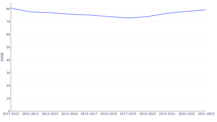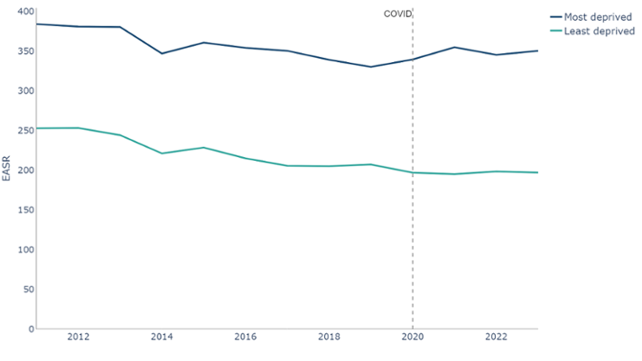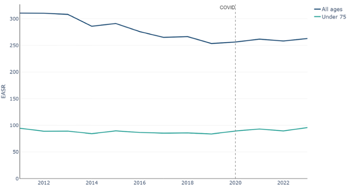 Age-standardised rates of avoidable mortality (Figure 7) for diseases of the circulatory system had been decreasing prior to COVID-19 but has seen an increase in recent years to 79 per 100,000 in 2021-23. In terms of the actual count, the number of avoidable deaths had been decreasing to a low of 6,445 in 2012-14. Since then it has gradually been increasing to 7,133 in 2021-23. It is clear that the improvements up to 2011 have stalled.