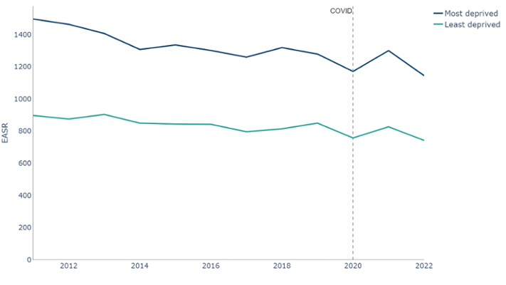 There is a significant and persistent gap in the cardiovascular disease mortality rates and admission rates between people living in the most and least deprived areas in Wales. This is also reflected in the prevalence count of cardiovascular disease risk factors, such as hypertension and living with obesity. The only exception to this is alcohol consumption. But, although individuals living in the most deprived areas may consume less alcohol, they tend to suffer worse alcohol related health outcomes (Lewer et al., 2016).