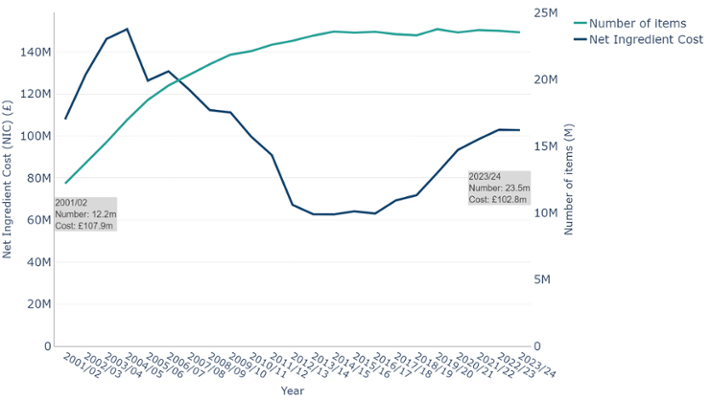 The net ingredient cost of dispensed prescriptions (Figure 8) reached a peak of £151 million in 2004/05, before decreasing to a low of £63 million in 2014/15. Since then it has gradually been increasing to £103 million in 2023/24. Over this period, the number of items dispensed has been increasing, nearly doubling between 2001/02 and 2023/24 where around 23.5 million prescriptions were dispensed. (Prescription items and cost by area and BNF chapter, Prescribing Services, NHS Wales Shared Services Partnership)