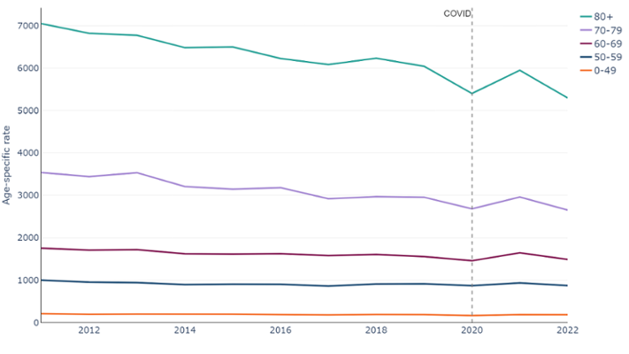 When considering these trends, it is important to consider the potential impact of the COVID-19 pandemic and primary care management in general. During the pandemic, access to services would have been reduced. This could have potentially led to a fall in diagnosis and treatments, followed a surge once available again, hence the sharp increase in the latest year. In relation to the general decline, as we can see from the prevalence data, conditions associated with cardiovascular disease are not in decline. The decline in admissions may be a result of better primary care management, through prescriptions for example.