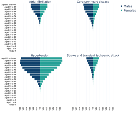 Figure 2: Cardiovascular disease and risk factor registers have higher prevalence in older people, with hypertension being more prevalent in females and atrial fibrillation, coronary heart disease and stroke/TIA males. (Quality Assurance and Improvement Framework, Welsh Government).