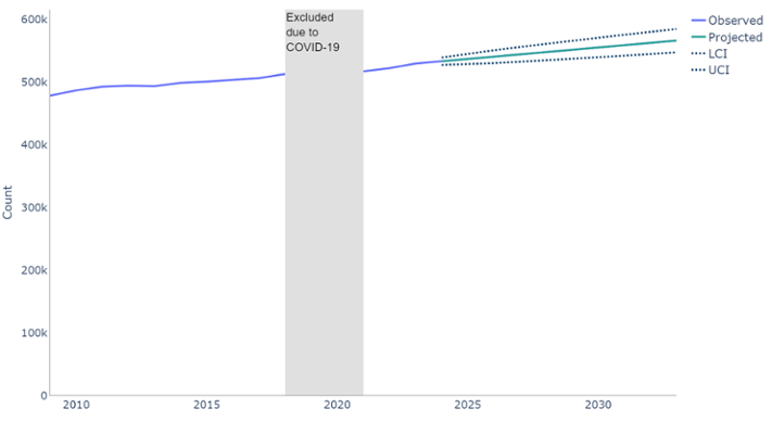 Our analysis primarily focuses on counts. We chose counts, as they are the most consistent data measure available to us over a long enough period to allow projections. An increase in prevalence counts does not necessarily mean an increase in prevalence rates as the total population may also increase.