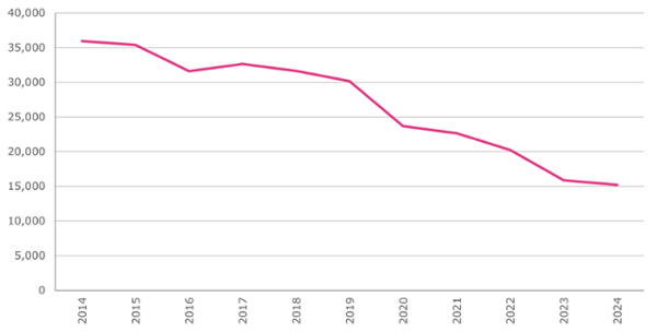 • There is a clear and statistically significant gradient in the percentage of babies being exclusively breastfed at 10 days by deprivation fifth in 2024. Each fifth shows a significantly different percentage than the fifth adjacent to it, highlighting a clear pattern of lower breastfeeding rates in more deprived groups and higher rates in less deprived groups. While there is a 19.2 percentage point difference between babies being breastfed in the most deprived fifth (48.9%) and least deprived fifth (29.6%), data from the last decade suggests that breastfeeding at 10 days has been on the increase in both groups (although only data from 2021 are presented due to data quality issues linked to the COVID-19 pandemic).