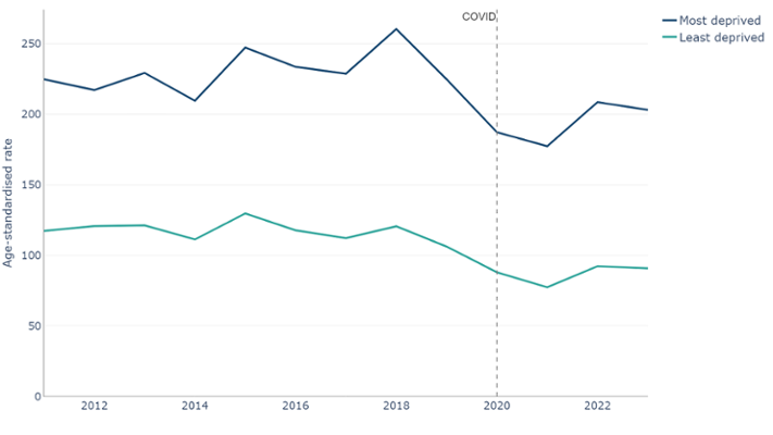 Those residing in the most deprived fifth are more than twice as likely to die from a respiratory disease compared with those residing in the least deprived fifth. In 2023, the age-standardised mortality rate in the most deprived fifth was 203 per 100,000 compared to 91 per 100,000 in the least (Public Health Mortality, Mid-Year Population Estimates, Office for National Statistics).