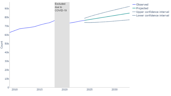 For our projections, we have used an ARIMA model. The model projects historic prevalence counts forward to 2033/34. The figure we refer to in the article, the central estimate, is the most likely estimate, given what has already been observed. We have also provided 95% upper and lower confidence intervals, estimating an interval in which a future prevalence might fall. These indicate that we are 95% confident that the predicted projection will fall within these bounds.