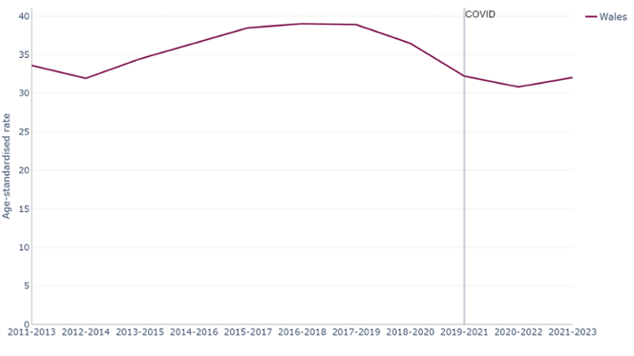 Prior to COVID-19, the age-standardised rate had been decreasing, and due to the ageing population of Wales, these may continue to fall, but absolute numbers and crude rates may continue to increase.