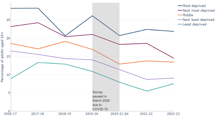 Figure 9: There is a clear pattern for the prevalence of current smokers increasing as deprivation increases. Smoking prevalence is almost 3 times higher in the most deprived fifth than the least deprived fifth. Note 1: Survey paused in March 2020 due to COVID-19. (National Survey for Wales, observed percentage, 2016/17 - 2022/23, Welsh Government).