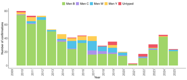 Number of laboratory reports of Neisseria meningitidis by serogroup in Wales 2010-2025